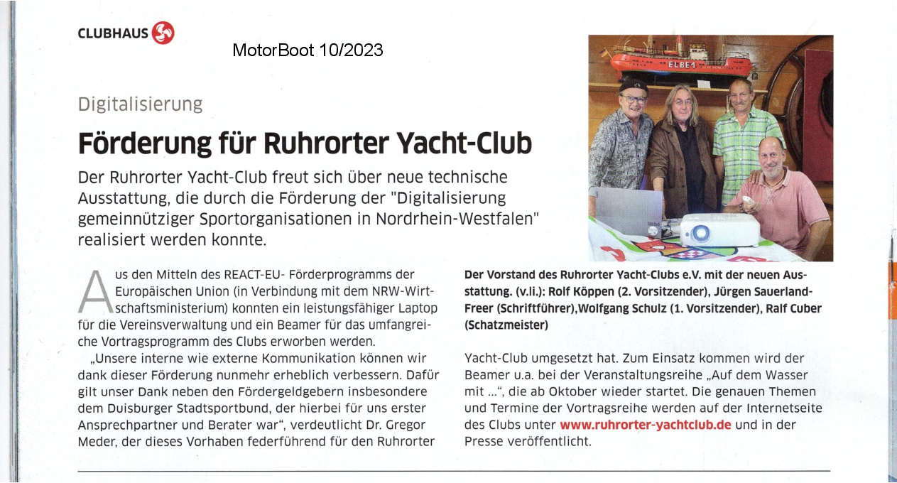 Wassersport-Fachmagazin MotorBoot, 10/2023: Digitale Förderung des Ruhrorter Yacht-Clubs. (Quelle: MotorBoot Magazin 10/2023)
